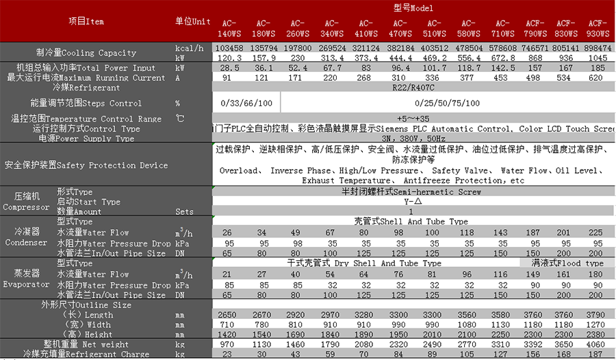 水冷螺杆冷水機組技術參數表(單壓縮機):