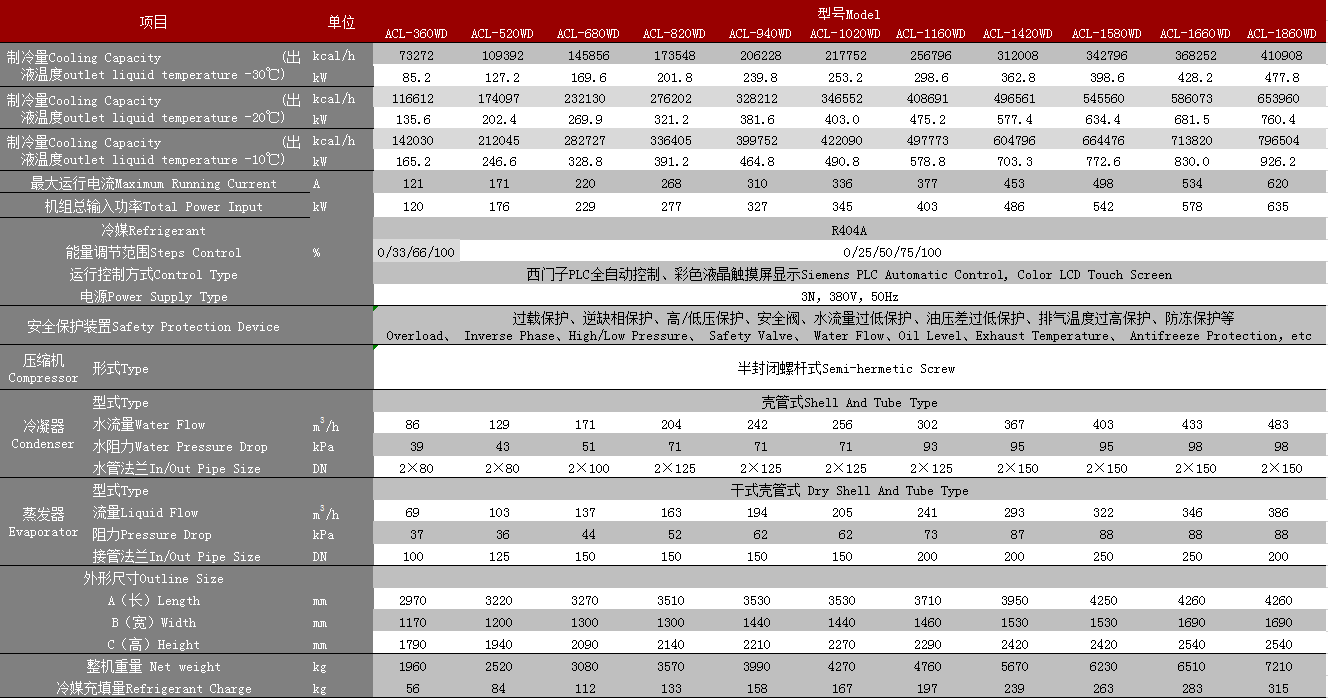 水冷螺杆低溫冷水機組技術參數表(biǎo)(雙(shuāng)壓縮機(jī)) :